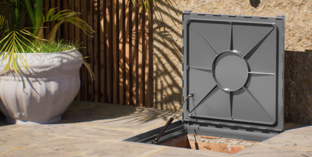 Uma tampa reforçada com acabamento rebaixado, suporte para veículos leves e estrutura durável para sua obra.